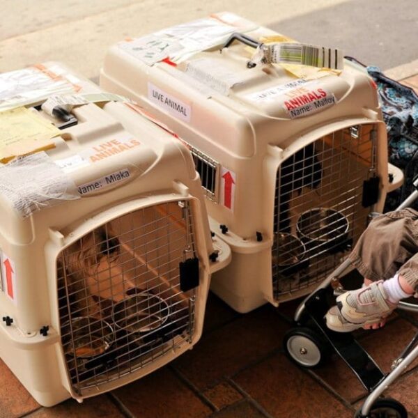 Einen Welpen allein an einen neuen Ort zu schicken, klingt immer grausam und peinlich, aber ich glaube, es ist für uns schwieriger als für die Welpen. Dank meiner langjährigen Erfahrung im Transport weiß ich, dass alle Welpen gut versorgt sind. Wenn man also darüber nachdenkt, werden die Fluggesellschaften die Welpen nicht aus Angst vor Klagen und Kundenunzufriedenheit misshandeln. Ich klebe Welpenfutter und Fütterungshinweise oben auf die Transportbox und stelle gefrorenes Wasser hinein, damit es für die Welpen langsam auftaut und den Welpen während des Fluges Futter angeboten wird.
